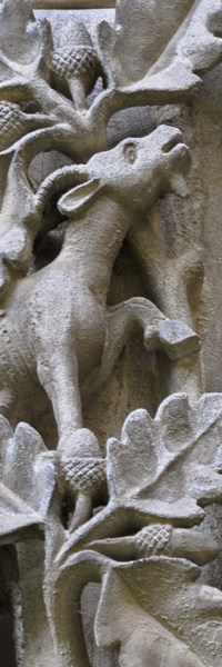El claustro, en cambio, es escenario de una eclosión de motivos vegetales, florales y animales, donde hojas de parra, racimos y seres fantásticos intentan hacerse hueco en medio de tanta naturaleza.